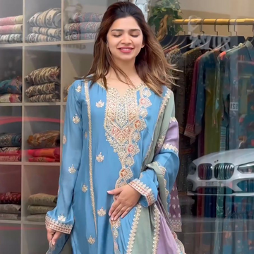 This blue palazzo suit represents a masterclass in ethnic embroidery, featuring hand-applied zari and sequin...