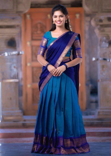 Navy Blue and Sky Blue Saree Set with Golden Zari Polka Dots and Border