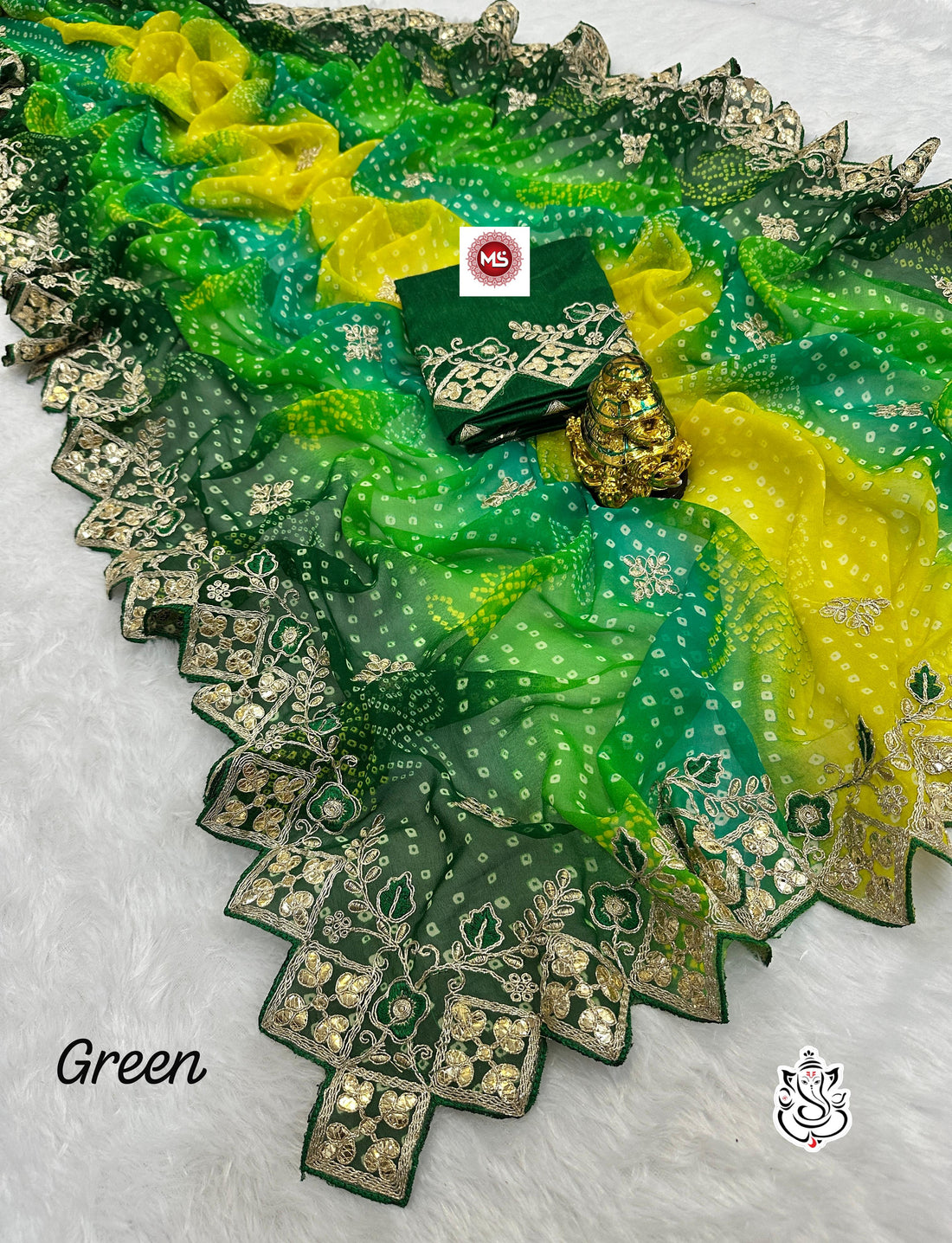 Green Bandhani Georgette Saree with Heavy Zari and Mirror Work Border