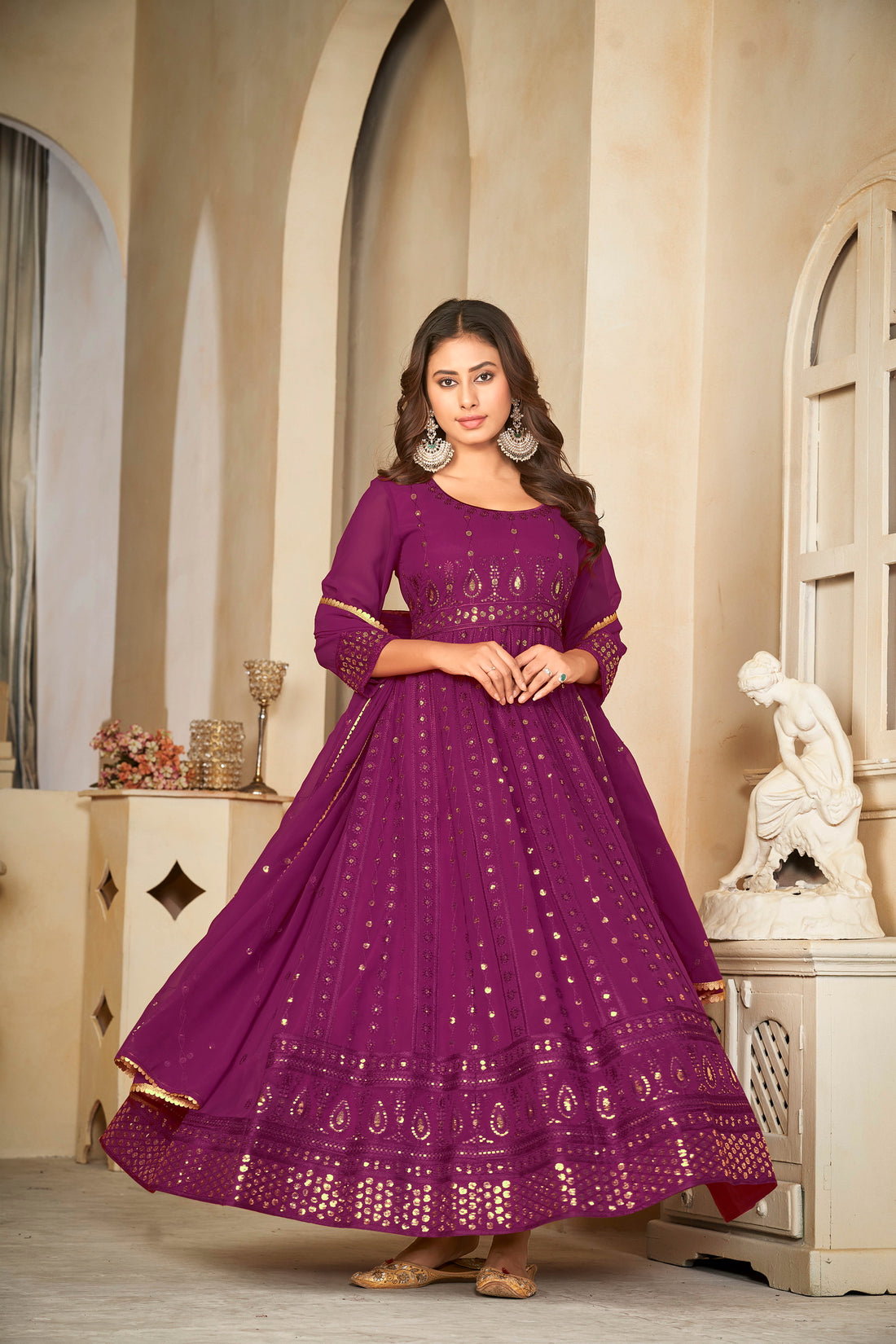 Embrace regal sophistication with this exquisite Purple Anarkali Suit, featuring radiant mirror work and intricate...