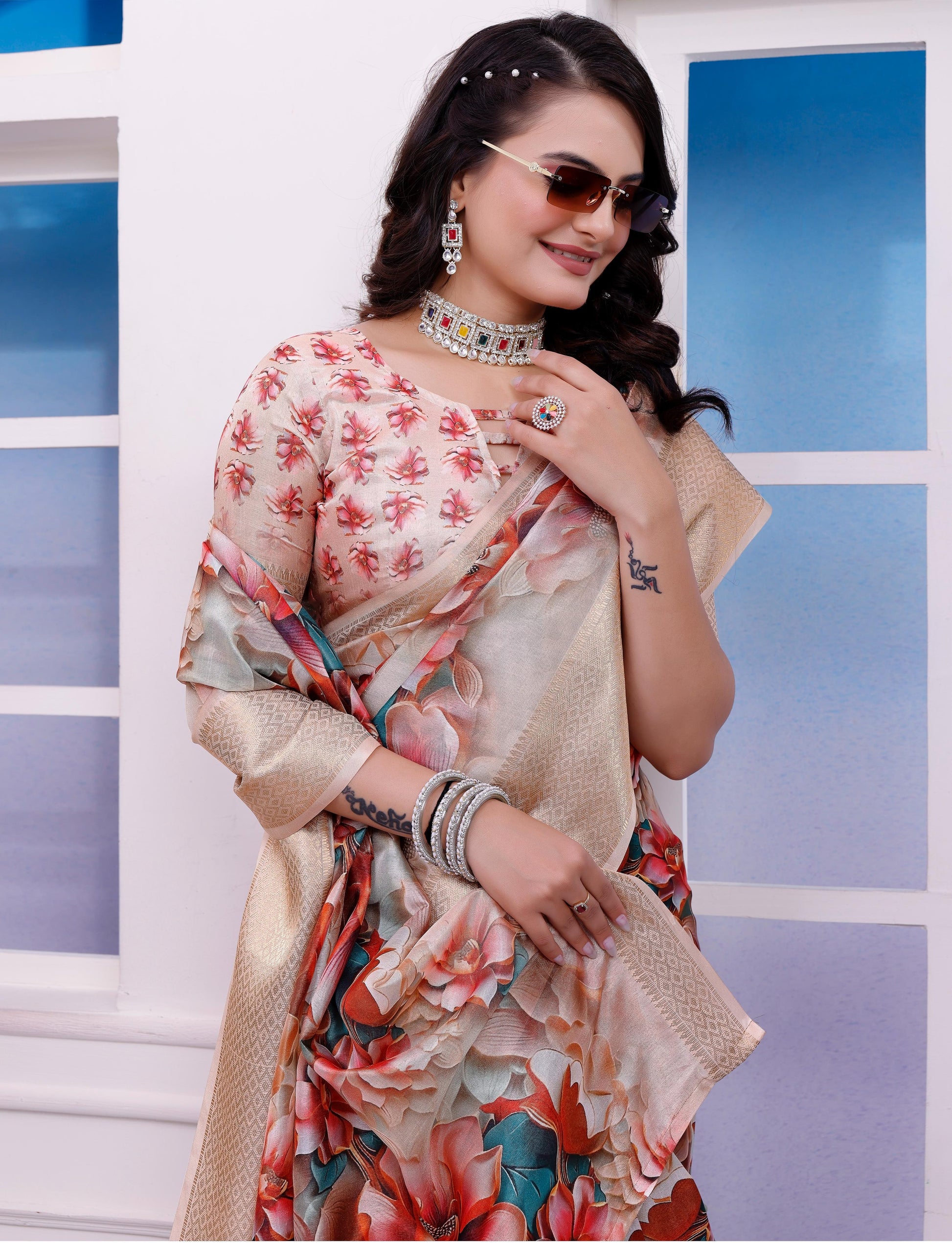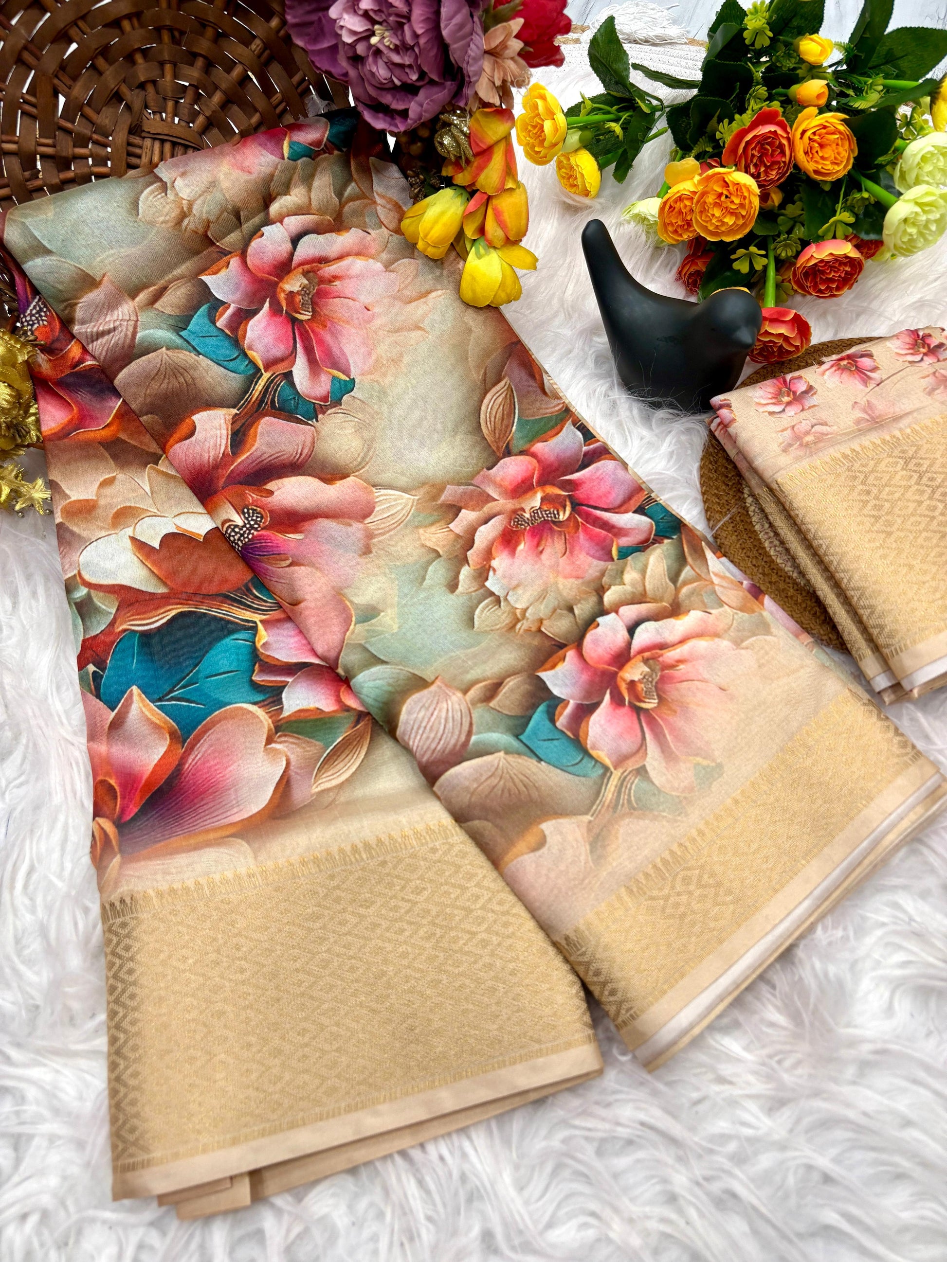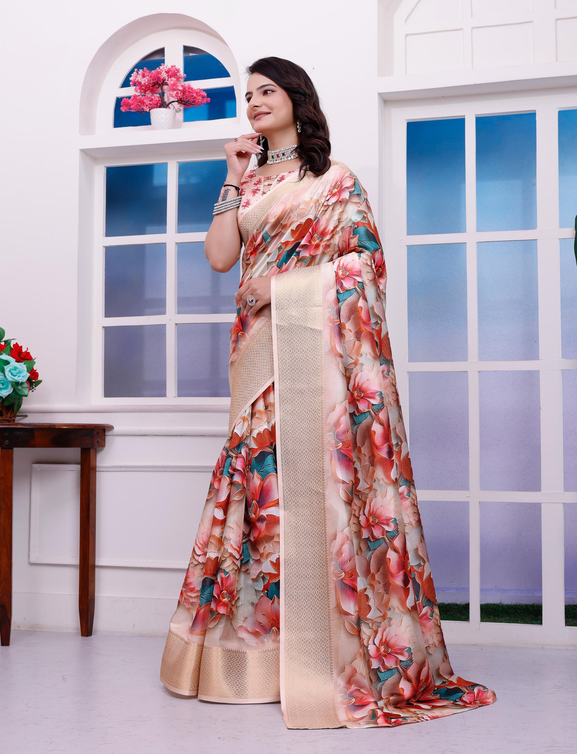 This exquisite multi-color floral printed organza saree showcases a harmonious blend of vibrant hues woven into an elegant botanical design. Crafted from premium organza fabric, it delivers a graceful drape with a refined, airy quality that's ideal for formal occasions and celebrations. The ornate golden border adorning the pallu and hem adds a touch of opulence, enhancing the saree's sophisticated appeal. The diverse color palette makes this piece remarkably versatile, complementing various skin tones and styling preferences. Perfect for discerning wearers seeking a statement piece that balances traditional artistry with contemporary flair.