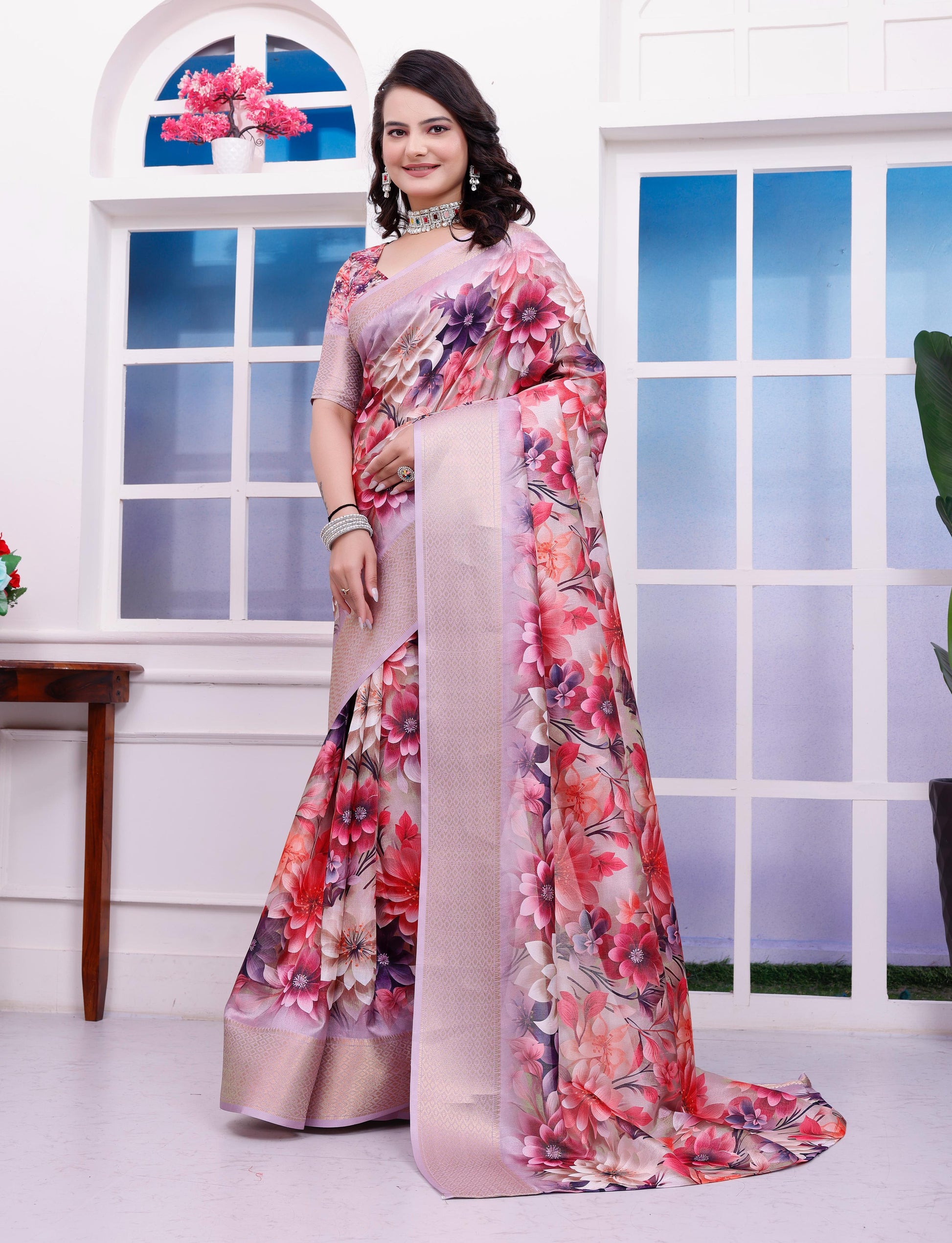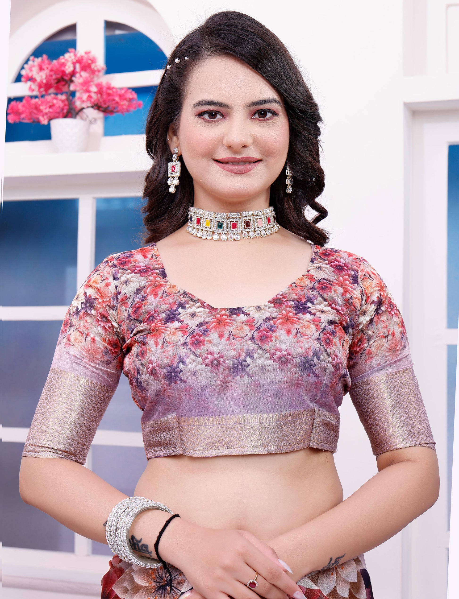Elevate your ethnic wardrobe with this stunning red organza saree, featuring an intricate floral print that captures timeless elegance. The luxurious organza fabric drapes beautifully, offering a lightweight yet structured silhouette perfect for festive occasions and celebrations. Complemented by a sophisticated golden border that frames the pallu and hem, this saree seamlessly blends traditional craftsmanship with contemporary design. The vibrant red hue paired with delicate florals creates a versatile piece suitable for weddings, parties, and cultural events. Ideal for those who appreciate refined aesthetics and quality fabrics.
