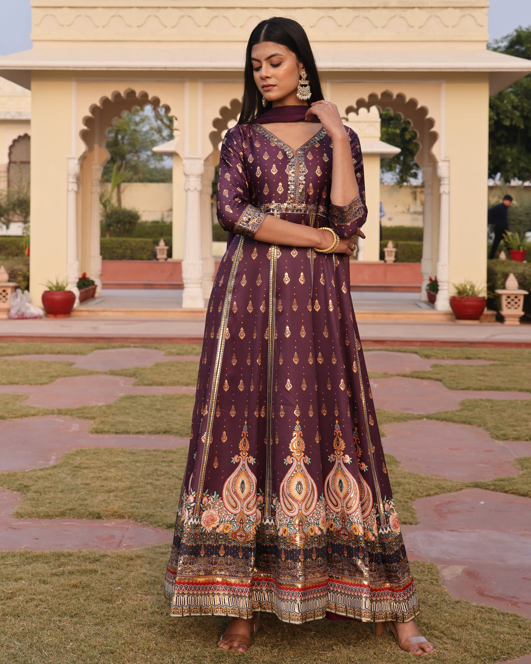 Royal Purple V-Neck Anarkali with Gota Patti and Paisley Print